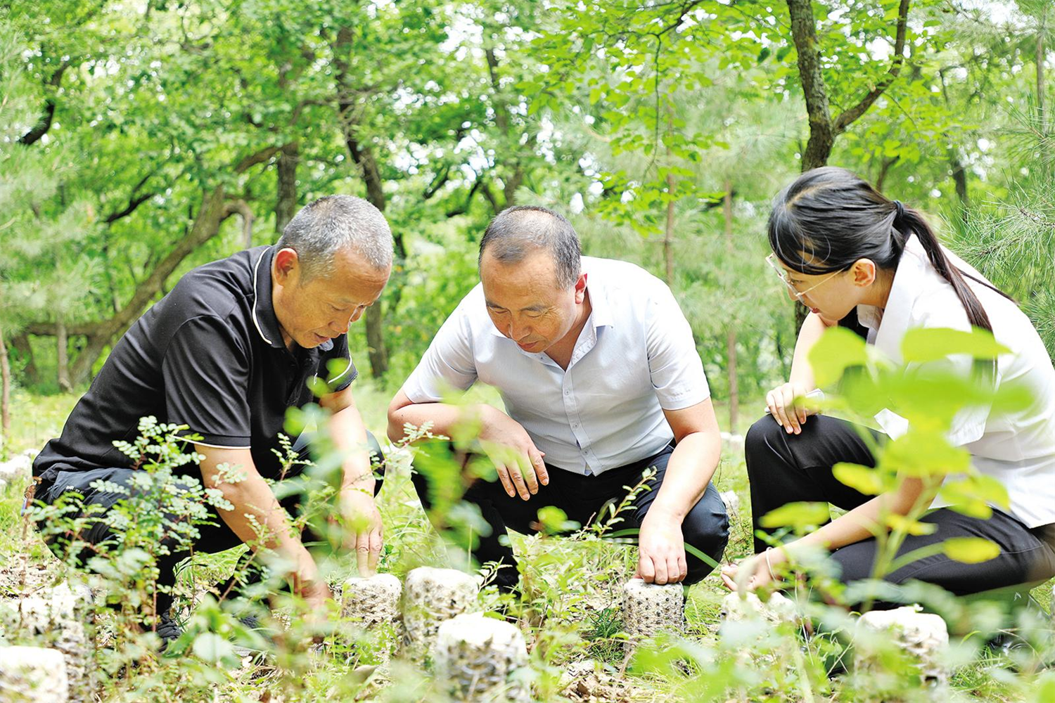 工作人员查看林下菌菇生长情况
